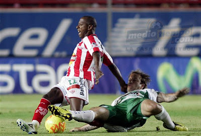 Santos comenzó a tocar, y en una centro precisio y precioso, Vuoso se levanta y remata certero un cabezaso que iba directo a gol, sin embargo Severo Meza mete la mano y se decreta penal y expulsion.